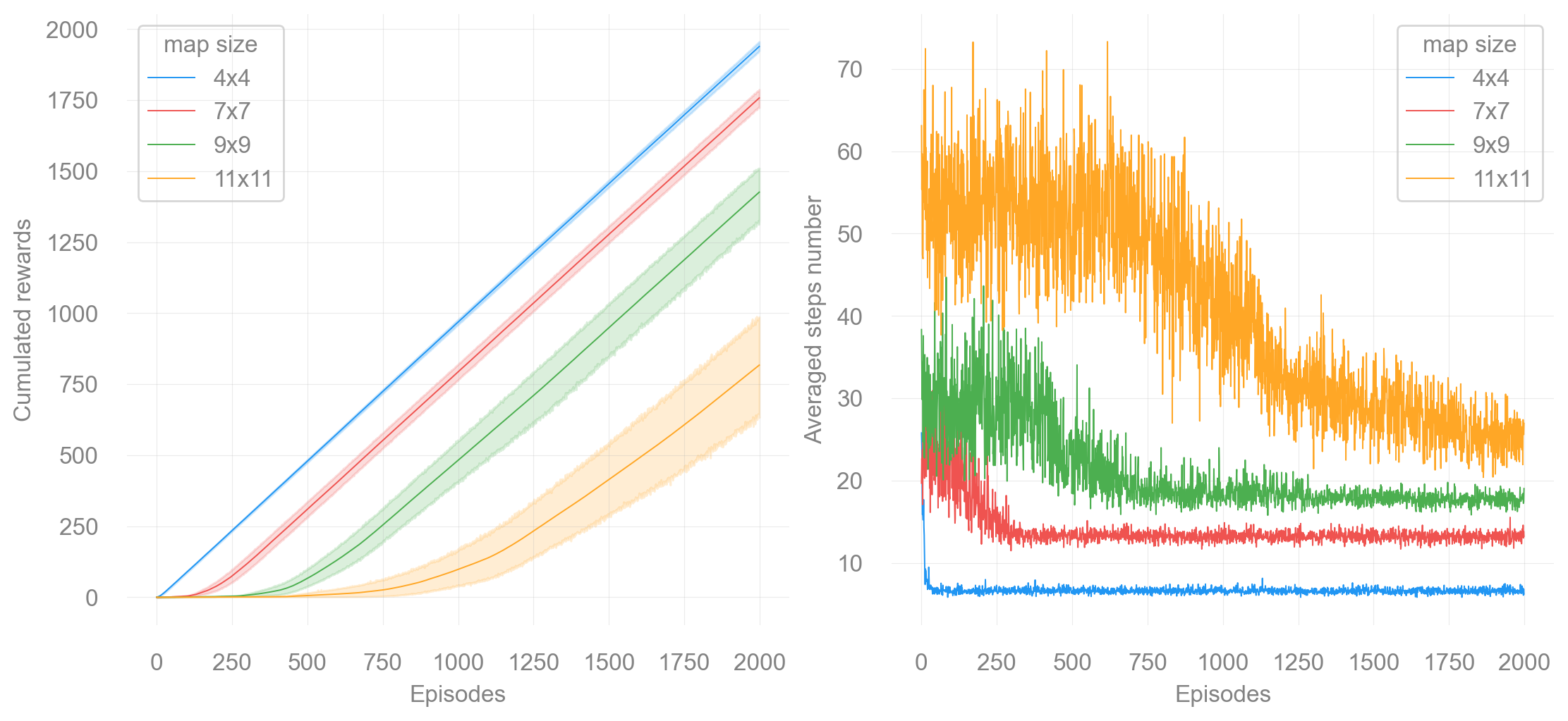 run_experiments(make_frozenlake_env(params), params, map_sizes)Map size: 4x4