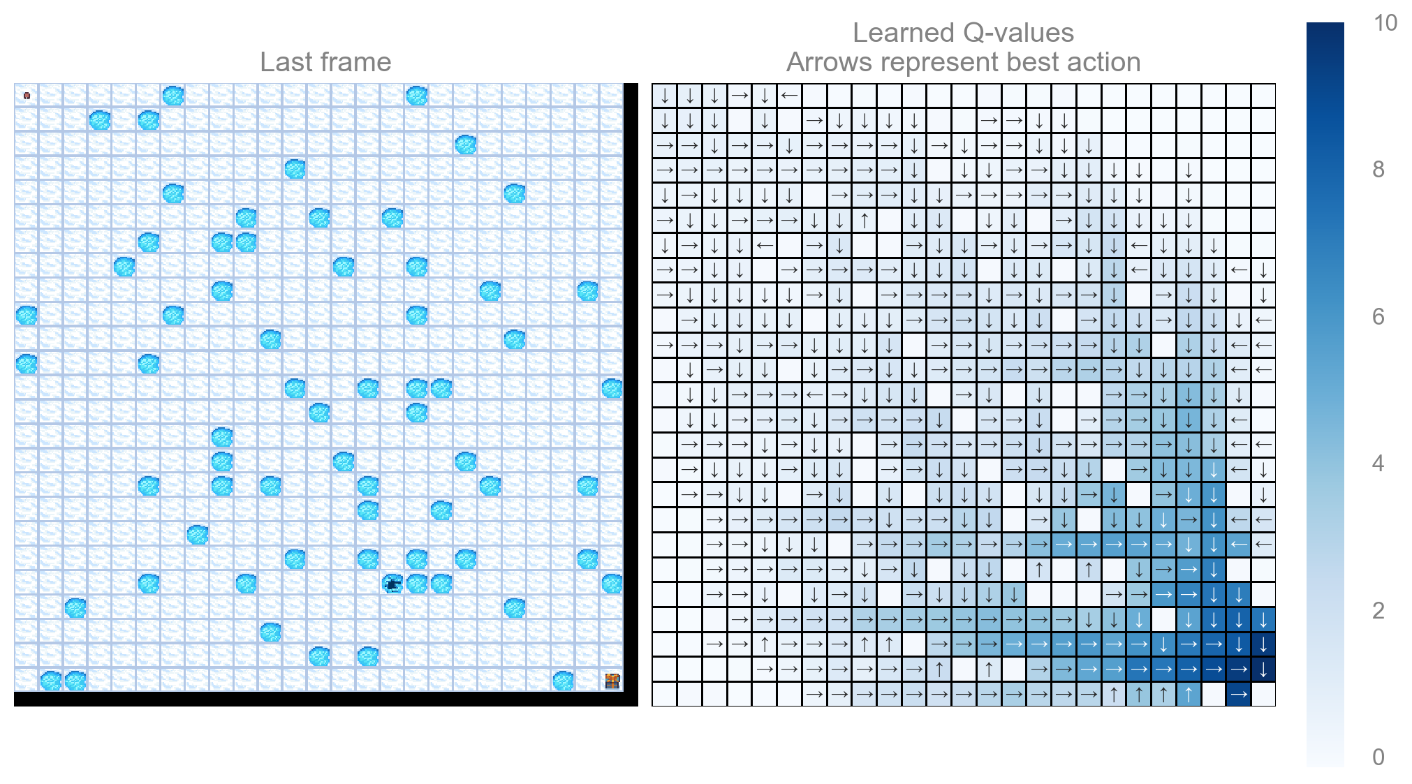 reward_schedule=(10.0, -10.0, -0.01), # reach goal, reach hole, reach frozen (includes Start)