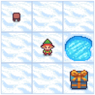 The frozen lake is a small, grid-based reinforcement learning environment. We play as an elf whose goal is to cross a frozen lake from the starting tile (top-left corner) to a present (bottom-right) corner, without falling into any holes along the way.